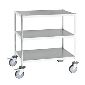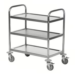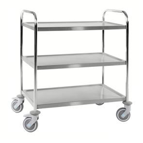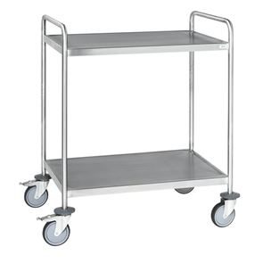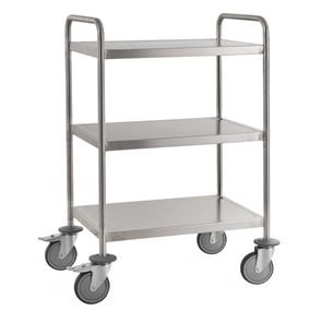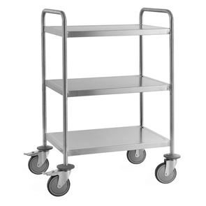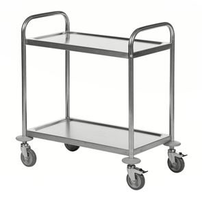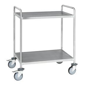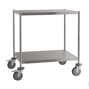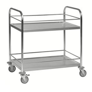 Serveringsvagn Rostfri. En serveringsvagn med underrede och skivor av rostfritt stål.  De omonterade vagnarna har skivor med vulstkant runtom. Skall torkas torr efter användning så inga vätskerester blir kvar.