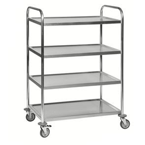Serveringsvagn Rostfri. En serveringsvagn med underrede och skivor av rostfritt stål. De omonterade vagnarna har skivor med vulstkant runtom. Skall torkas torr efter användning så inga vätskerester blir kvar.