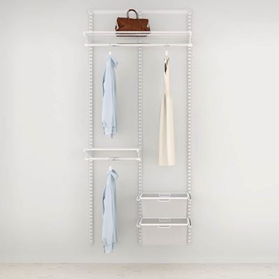 Hyllsystem ELFA Hallförvaring 3. Elfas klassiska väggmonterade förvaringssystem för hall och garderob. Består av bärlist, väggskenor, konsoler, hyllplan, backar och klädstång med mera. Perfekt som klädförvaring i hall eller i garderob. Finns i olika färdiga paket eller som delar.