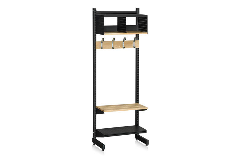 Klädfack Savalen, enkelsidig, B 600 mm, svart, modell C, utbyggnad. Praktiskt och smidigt klädfack med flera olika utrustningsalternativ. Finns både som golvställ och väggställ. Bygg din egen lösning med grundsektioner och utbyggnadssektioner. Utrustningen är flyttbar i steg om 25 mm. Golvställen är utrustade med ställfötter för ojämnt underlag. Modell A: Skohylla med dropplåt, sittbänk, kroklist och hatthylla i trådutförande. Modell B: Skohylla med dropplåt i trådutförande, sittbänk och kroklist i björk. Modell C: Skohylla med dropplåt och klädfack i perforerad plåt, sittbänk och kroklist i björk. Modell D: Vinklingsbar skohylla och kapprumshylla i perforerad plåt, sittbänk i björk.