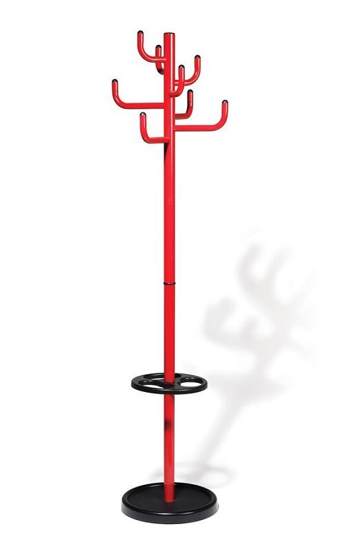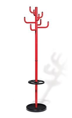 Klädhängare, H 1700 mm, Ø 450 mm, 8 rockhängare, röd. Vacker och funktionell, en stabil och robust klädhängare. Stolpe och krokar av pulverlackerat stål. Kommer med paraplyhållare som standard. Står säkert tack vare den tunga foten med betongfyllning. Finns i tre olika färger, svart, silver eller röd.