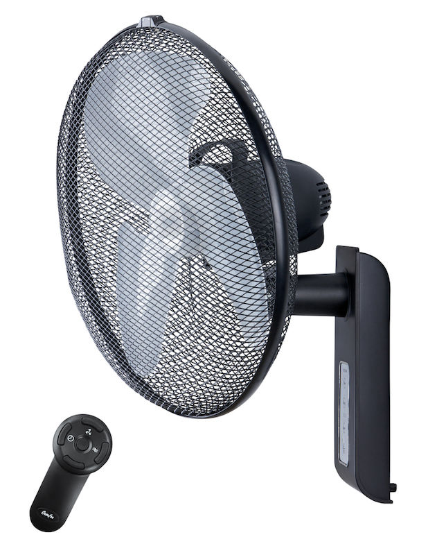 Väggfläkt Aaron. Väggfläkt med fjärrkontroll, halvtransparent fläkthjul, 85°-oscillering (frånkopplingsbar via fjärrkontroll), 3 hastighetslägen kan ställas in med tryckknapp, LED-indikering av funktioner, fläkthus och -hjul av slagfast plast, optimerat fläkthjul med tre blad, korglutning max. ca 35°, 2,5 m sladd med platt EU-kontakt. Fläkten är certifierad för kommersiell användning i enlighet med maskindirektiv 2006/42/EC del 1.