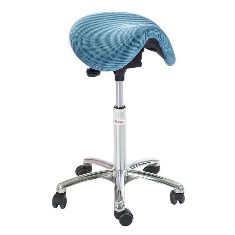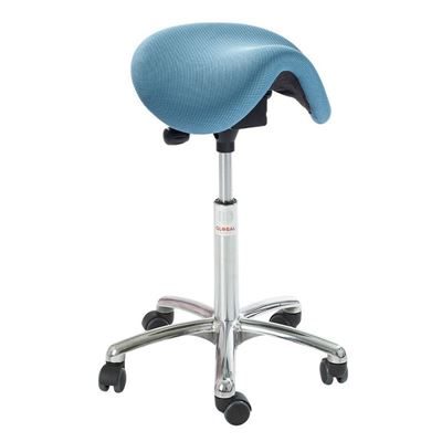 Sadelstol Dalton, ljusblå tyg, utan ryggstöd, fast sits . Sadelstol Dalton är formad som en ”klassisk” cowboysadel, vadderad med skum och klädd i konstläder eller tyg. Den ger god komfort och en ergonomisk arbetsställning under arbetet. Den naturligt avslappnade hållning och raka rygg som sadelstolen främjar gör att man kan sitta längre perioder utan att belasta kroppen fel. Sadelstolen passar dig som vill stärka upp ryggen och förbättra din sittställning.
