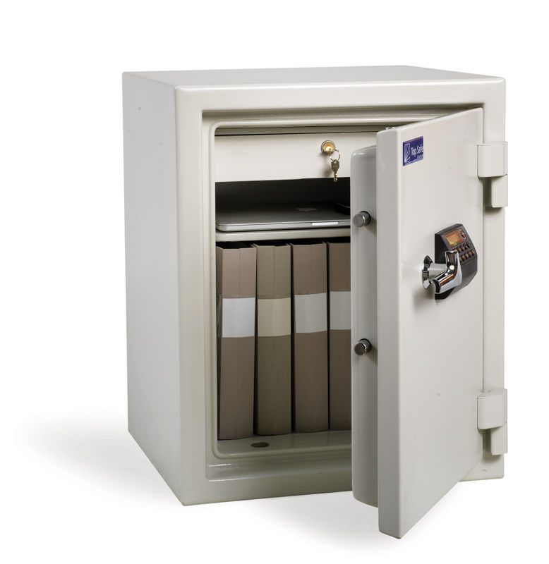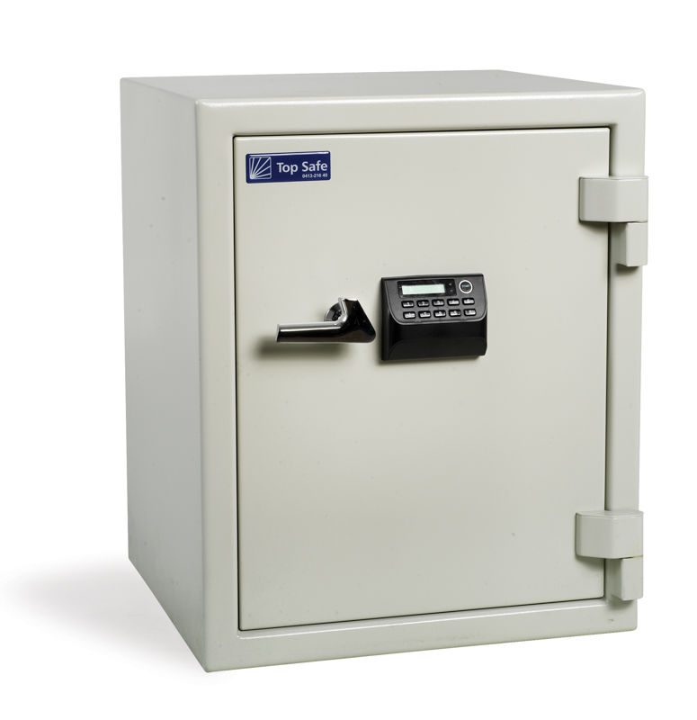 Dokumentskåp ES 065, NT Fire 017, 120P, BxDxH 557x507x677 mm. ES-serien består av brandskyddade dokumentskåp som skyddar papper vid brand. Skåpen är testade enligt NT Fire 017 och klarar 120P (2 timmars brand). Skåpen är inredda med flyttbara hyllor för A4-pärmar samt en låsbar låda för mindre saker. Lådan kan lätt demonteras och då kan utrymmet nyttjas till ytterligare pärmförvaring. Den låsbara lådan kan tas bort på alla modeller utom ES700. Skåpen är som standard utrustade med elektroniskt kodlås med två utbytbara koder samt tidsfördröjning vid upprepade felslag av koden. Låset är borrskyddat med en sprängsäkring som låser regelverket vid inbrottsförsök. Förankringssats medföljer, förberett för bultning i botten. Finns i flera olika storlekar.