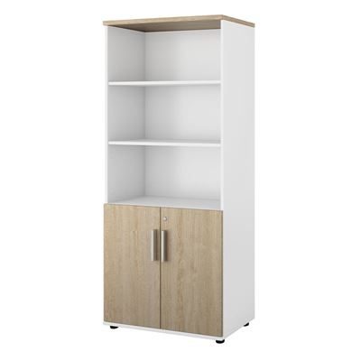 Bokhylla Portland, BxDxH 800x420x1845 mm, vit/ek, med dörrar, dörrhöjd 700 mm. Färdigmonterad förvaring i två höjder. Finns som öppen hylla eller med olika dörralternativ beroende på om man vill dölja innehållet i hyllan eller ej. Dörrarna levereras med kraftigt lås som standard. Stommarna är tillverkade i vit eller grå laminat och dörrarna finns i vit, lönn eller ek. Samtliga fötter är justerbara så man kan ställa hyllan rakt på ojämnt underlag. Finns i olika storlekar.