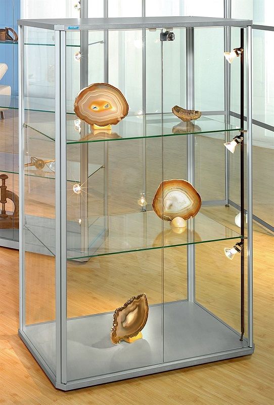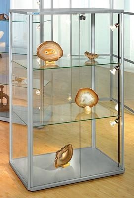 Glasskåp Ljusnan, BxDxH 820x420x1280, 3 st spotlights, designad halvhög vitrin med lågspänningsbelysning. För varje behov och användningsområde. De avfasade hörnen ger montrarna en exklusiv prägel. Silvereloxerade aluminiumprofiler i hög kvalitet. Väggar och dörrar av 4 mm tjockt härdat säkerhetsglas. Steglöst ställbara hyllplan av härdat säkerhetsglas. Dörrarna sitter på en vertikal aluminiumaxel i fullhöjd och kan därmed öppnas utan gångjärn. Säkerhetscylinderlås med 2 nycklar. Över- och underdel av MDF-skivor i aluminiumsilver färg (RAL 9006). Bottenskivan är urfräst på undersidan och har plats för de dolda monterade hjulen vid förflyttning, eller för en transformator för lågvoltsbelysning (finns som tillval). Skensystem med 20 W punktbelysning, steglöst ställbara i höjd. Glasskåp levereras omonterade. Aluminiumprofilerna är permanent fabriksmonterade på de härdade säkerhetsglasen. Denna glasmonter monteras enkelt och snabbt med ett nyutvecklat plugg- och fixsystem. När de inte används, eller om de ska flyttas till annan plats, kan de lätt tas isär igen och passar därför utmärkt för mässor och utställningar.