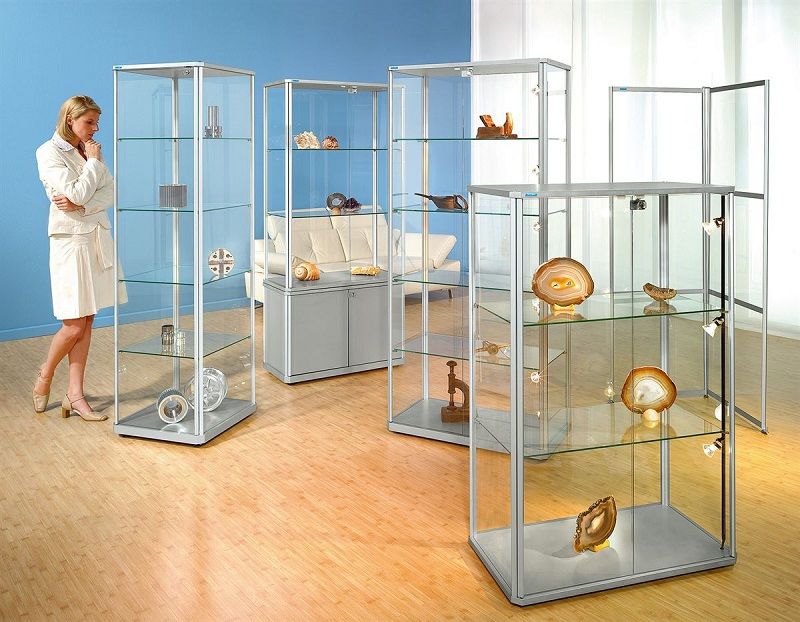 Glasskåp Ljusnan, BxDxH 820x420x1800, designad vitrin med underskåp, utan belysning. För varje behov och användningsområde. De avfasade hörnen ger montrarna en exklusiv prägel. Silvereloxerade aluminiumprofiler i hög kvalitet. Väggar och dörrar av 4 mm tjockt härdat säkerhetsglas. Steglöst ställbara hyllplan av härdat säkerhetsglas. Dörrarna sitter på en vertikal aluminiumaxel i fullhöjd och kan därmed öppnas utan gångjärn. Säkerhetscylinderlås med 2 nycklar. Över- och underdel av MDF-skivor i aluminiumsilver färg (RAL 9006). Bottenskivan är urfräst på undersidan och har plats för de dolda monterade hjulen vid förflyttning, eller för en transformator för lågvoltsbelysning (finns som tillval). Skensystem med 20 W punktbelysning, steglöst ställbara i höjd. Glasskåp levereras omonterade. Aluminiumprofilerna är permanent fabriksmonterade på de härdade säkerhetsglasen. Denna glasmonter monteras enkelt och snabbt med ett nyutvecklat plugg- och fixsystem. När de inte används, eller om de ska flyttas till annan plats, kan de lätt tas isär igen och passar därför utmärkt för mässor och utställningar.