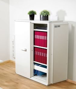 Flexibelt närarkiv som skyddar alla pågående arbeten. Skåpen kan med fördel placeras sida vid sida. Den unika dörrkonstruktionen ger ändå full åtkomst.