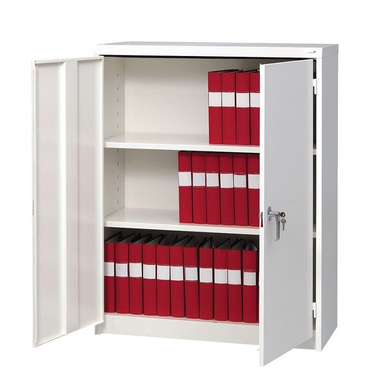 Ett mycket rejält helsvetsat plåtskåp med eller utan glasdörrar. 2 eller 4 flyttbara hyllor beroende på modell. Kvalitetsnivån testad enligt SS83 90 30 Funktion och säkerhet enligt SS-EN1153 Möbelfaktas extra höga krav på ytors tålighet. Pulverlackerad, en stryktålig lackering av hög kvalité. Bredd 520 eller 1000 mm, finns i två olika höjder. Färger vitt, blått eller svart. Glasdörrar är försedda med härdat glas. Spanjolettlås med 2 nycklar ingår som standard, går att få med elektromekaniskt lås också. Tillbehör som extra hyllplan, hängmappsram och utdragbar hylla finns att köpa separat. Antal pärmar A4: 17 st/hyllplan.