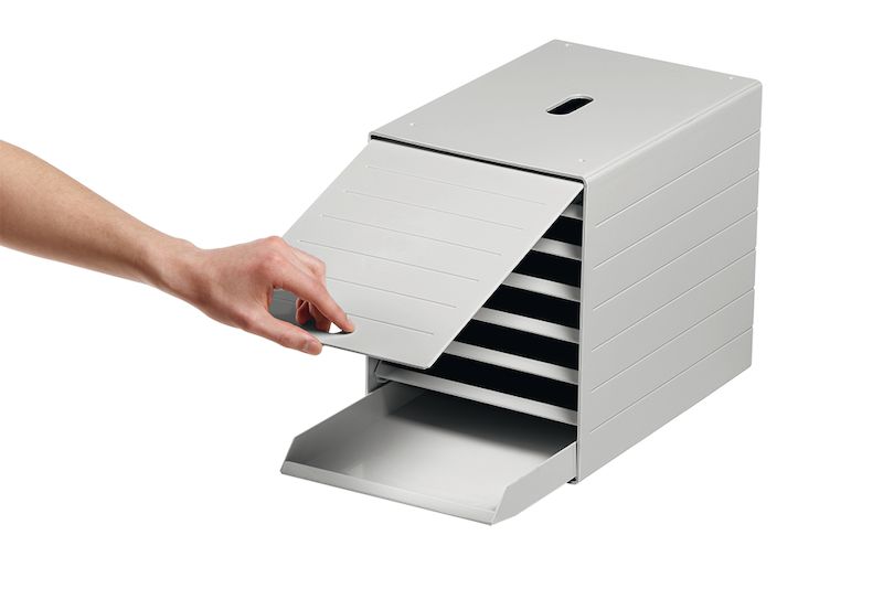 Blankettbox Idealbox 7-fack med nedfällbart lock. För arkivering på skrivbordet eller i bokhyllan, kan skruvas fast direkt på väggen. Stapelbar. Praktiskt handgrepp gör den enkel att flytta. 7 st brevkorgar för effektiv förvaring.