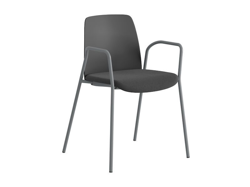 BeskrivningStol Helmer, sits stoppad, ryggstöd plast, 4-pack, sits mörkgrå/svart, underrede silver, med armstöd