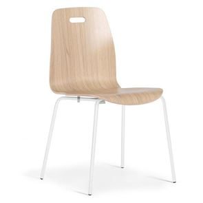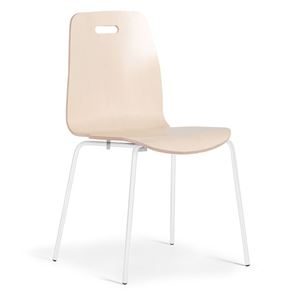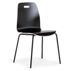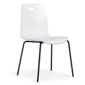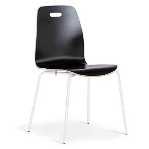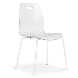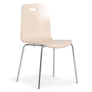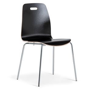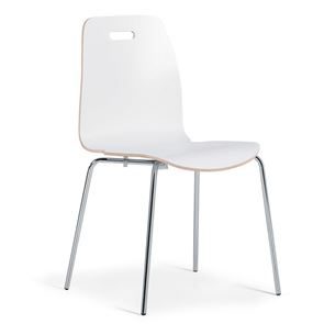 Skalstol Alina. En stapelbar skalstol för lunchrum och konferensrum. Finns i flera färger. Formpressad sits och rygg i ett stycke med en yta av hård och slitstark högtryckslaminat. Underredet i form av en kryssfot är kromat eller lackerat.