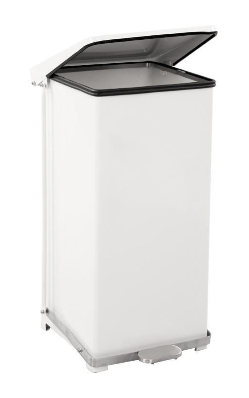 Papperskorg Manuel, stålplåt, vit RAL 9016, volym 90 l, HxBxD 770 x 445 x 435 mm. Hus och lock av vit pulverlackerad stålplåt.
