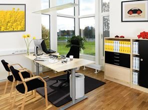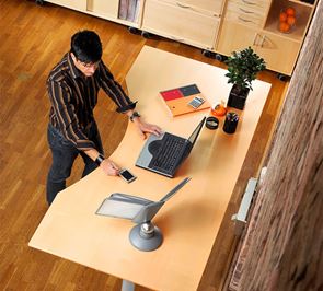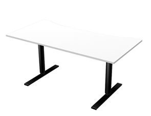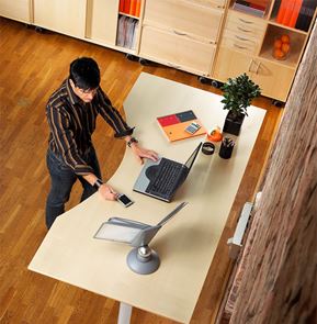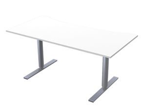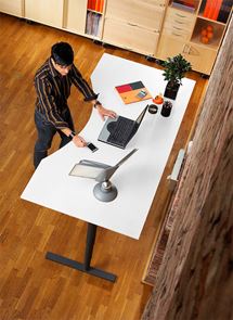 Höj och sänkbara skrivbord med runda ben och maguttag. Möblera för framtiden! Svensktillverkade skrivbord med elegant och stilren design. Höj och sänkbara skrivbord med slitstarka och tåliga skivor i laminat. Stabil konstruktion med dubbla tvärstag mellan benen direkt under skivan. Maguttag och runda ben. Finns i flera olika utföranden på skivan och benpar.