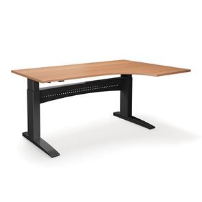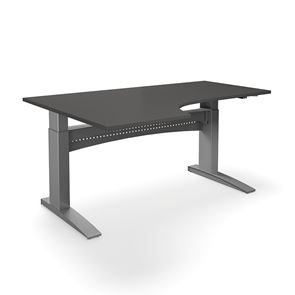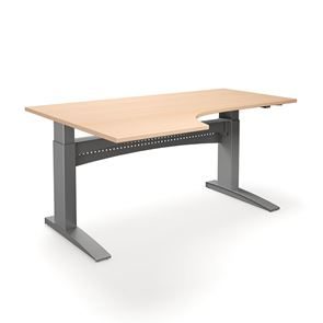 Höj och sänkbart hörnskrivbord Denver. Elektriskt höj och sänkbart skrivbord, H 630-1200 mm, hastighet 30 mm/s synkronlift. Maxbelastning 150 kg (utbredd belastning). Stativ i svart strukturlack (RAL 9004) eller silver strukturlack (RAL 9006). Bredd på stativet är 1560 mm. Skivan finns går att få i både laminat och fanér. Laminat: Bordsskiva finns belagd med en bok, björk, ek eller vitfärgad laminat med kantlist av ABS-plast. Bordsytan är hård och mycket tålig mot repor och slag. Färgen är konstant, den ändrar sig med andra ord ej utseendemässigt när den åldras. Fanér: Bordsskiva finns belagd med ett tunt skikt av riktigt trä i bok eller björk med kantlist av massivträ. Ytan har en naturlig träkänsla och är mjukare än laminat. Precis som i naturen åldras trä och får med tiden en vacker patina som bara ett naturligt material kan få.