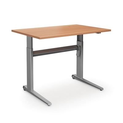 Höj och sänkbart skrivbord Dallas, rak, LxB 1200x800 mm, bok/silver. Ett lätt och enkelt höj och sänkbart skrivbord. Justerbar höjd 685-1205 mm inklusive skiva, hastighet 25 mm/s. Maxbelastning 80 kg utbredd belastning. Stativ utrustat med 2 hjul som gör bordet enkelt att flytta, perfekt för när man vill kunna ändra om på kontoret. Bordsskiva finns i bok, björk, ek, vit eller grå laminat, tjocklek 25 mm. Laminat är en skiva belagd med en bok, björk, ek, vit, gråfärgad laminat med kantlist av ABS-plast. Bordsytan är hård och mycket tålig mot repor och slag. Färgen är konstant, den ändrar sig med andra ord ej utseendemässigt när den åldras och kommer se likadan ut efter år av användning.