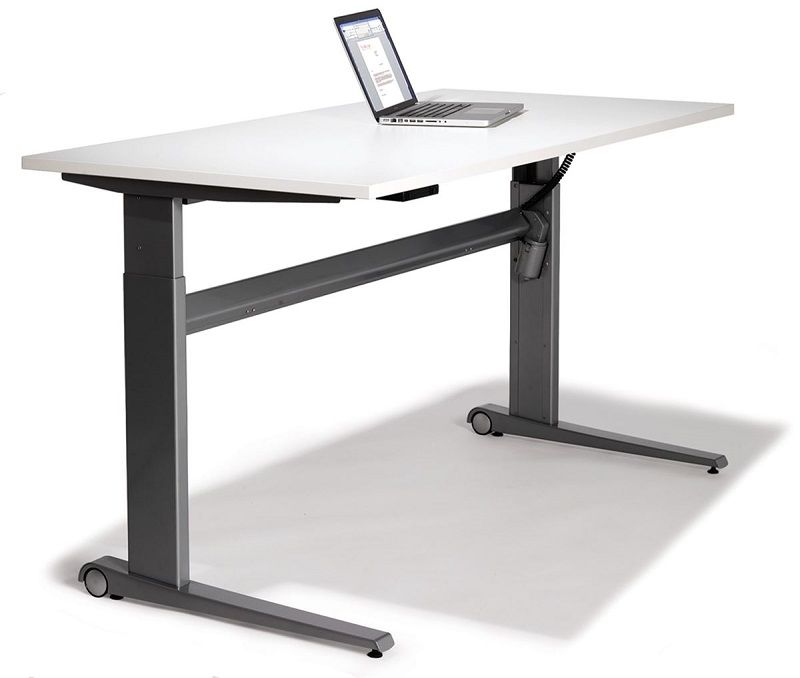 Höj och sänkbart skrivbord Dallas, rak, LxB 1600x800 mm, vit/silver. Ett lätt och enkelt höj och sänkbart skrivbord. Justerbar höjd 685-1205 mm inklusive skiva, hastighet 25 mm/s. Maxbelastning 80 kg utbredd belastning. Stativ utrustat med 2 hjul som gör bordet enkelt att flytta, perfekt för när man vill kunna ändra om på kontoret. Bordsskiva finns i bok, björk, ek, vit eller grå laminat, tjocklek 25 mm. Laminat är en skiva belagd med en bok, björk, ek, vit, gråfärgad laminat med kantlist av ABS-plast. Bordsytan är hård och mycket tålig mot repor och slag. Färgen är konstant, den ändrar sig med andra ord ej utseendemässigt när den åldras och kommer se likadan ut efter år av användning.