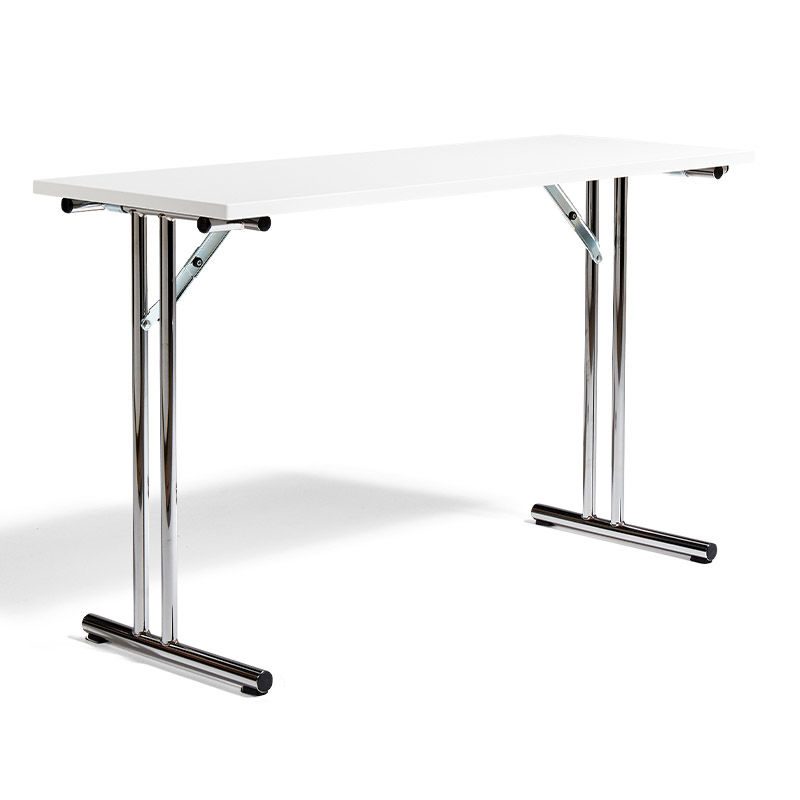 Konferensbord Byggbar, LxB 1200x450 mm, vit/krom. Ett fällbart konferensbord som är lätt att placera ut och anpassa efter eget behov. Kombinera med hörnskivor, frontpaneler eller mellanskivor och skapa ett bord helt efter ditt behov. Borden är hopfällbara med fällbara T-ben tillverkade av stålrör som finns i kromat och lackerat utseende. Längd: 1200 mm. Välj mellan bredden 450 mm eller 600 mm beroende på hur djupt du vill ha ditt bord. Skivan finns i bok, björk eller vit laminat.