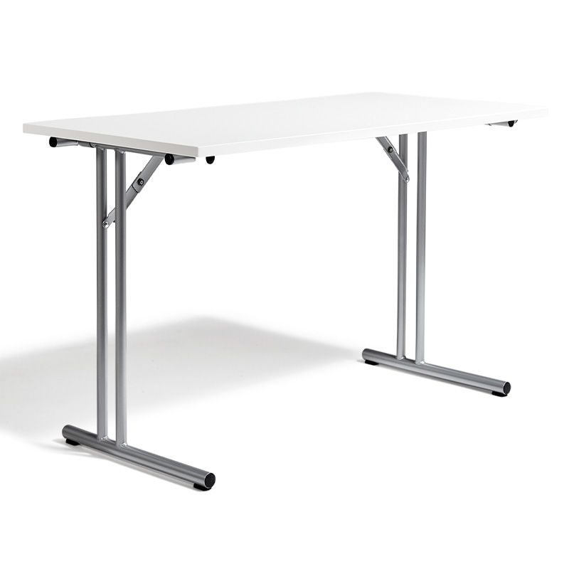 Konferensbord Byggbar, LxB 1200x600 mm, vit/silver. Ett fällbart konferensbord som är lätt att placera ut och anpassa efter eget behov. Kombinera med hörnskivor, frontpaneler eller mellanskivor och skapa ett bord helt efter ditt behov. Borden är hopfällbara med fällbara T-ben tillverkade av stålrör som finns i kromat och lackerat utseende. Längd: 1200 mm. Välj mellan bredden 450 mm eller 600 mm beroende på hur djupt du vill ha ditt bord. Skivan finns i bok, björk eller vit laminat.