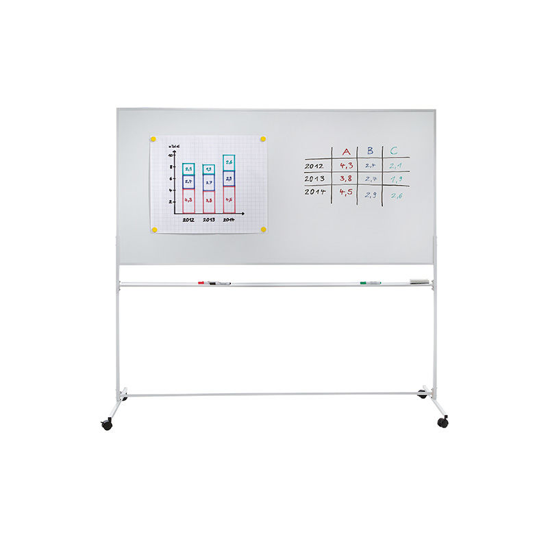 Den dubbelsidiga whiteboarden har två stora skrivytor. Silveranodiserad aluminumram med rundade hörn i plast. Stabil konstruktion för daglig användning.