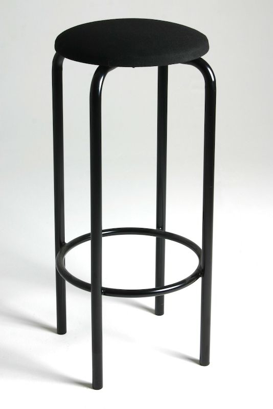 Enkel och gedigen barstol med träsits klädd i svart galon och svartlackerat stativ.