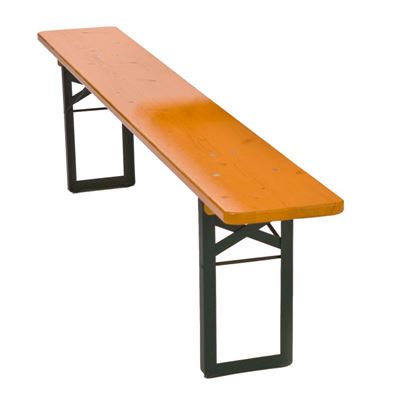 Massiv naturfärgad skiva i trä och fällbart benstativ som är pulverlackerade i grönt. En praktisk och smidig fällbar utomhusbänk som passar perfekt till fikastunden utomhus, evenemang, fester, mässor med mera. Med fällbara benstativ är det enkelt att snabbt plocka fram möblerna likväl som att plocka undan när du så önskar.