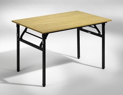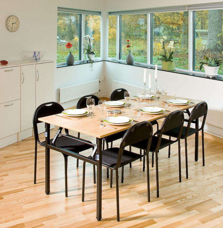 Starko fällbord, 1200x800 mm, ek/svart. Fällbord med laminatskiva och kraftigt stativ med ställfötter. Svartlackerat bordsunderrede i 30x30 mm stålrör, fälls upp eller ihop med ett enkelt handgrepp. Staplingsdistanser ger bra skydd av bordsskivan samt säker och stabil stapling.