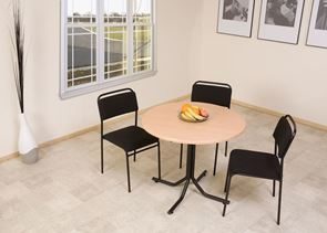 Klassisk och funktionell möbel med gedigen konstruktion och bra kvalité. Runt lunchbord med svartlackerat centrumstativ samt skiva i boklaminat.