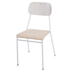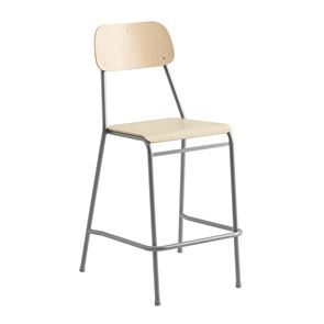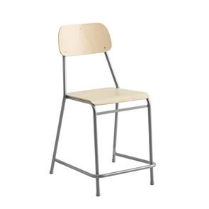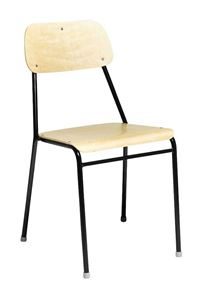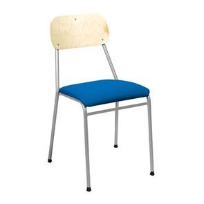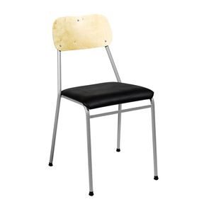 Matsalsstol Pontus. Stapelbar stol med stålstativ i silverlackerad färg. Stolsits och rygg i formpressad björk. Sits klädd i galon, tyg alternativt i formpressad björk.