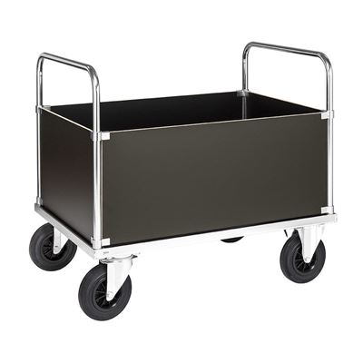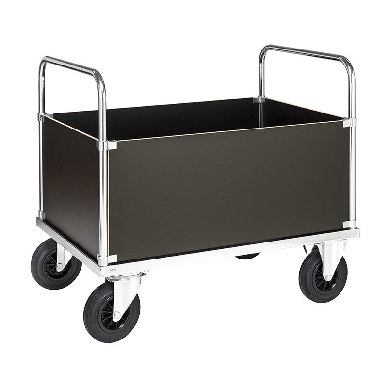 Elförzinkad stålkonstruktion. Hyllplan och sidor av MDF direktlaminat. Lådvagnen är utrustad med ett greppvänligt handtag på varje kortsida, placerat i en höjd av 900 mm. Ergonomiskt handtag finns som tillbehör till vagnar med bygel på kortsidan. Lådvagnen håller godset på plats med hjälp av 400 mm höga sidor.