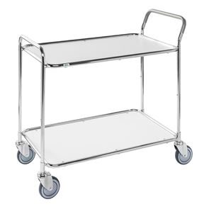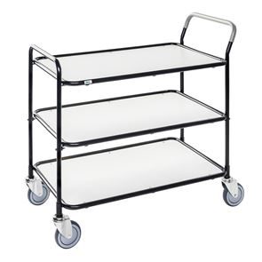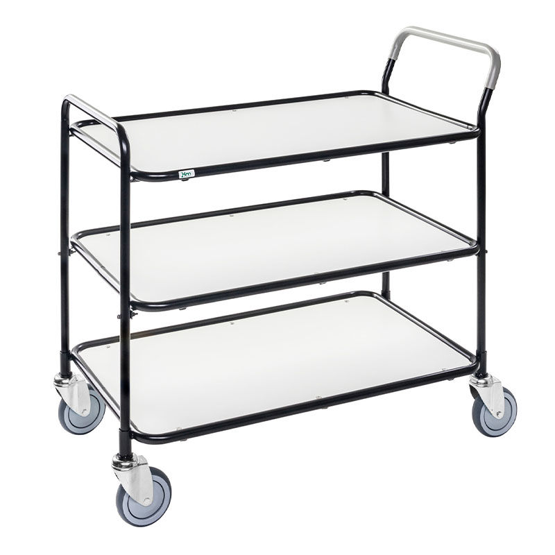 Två släta lättrengörliga hyllplan av laminat gör att rullvagnen är enkel att underhålla och fungerar utmärkt i miljöer där mycket användning krävs. Välj mellan utföranden med två eller tre hyllplan.