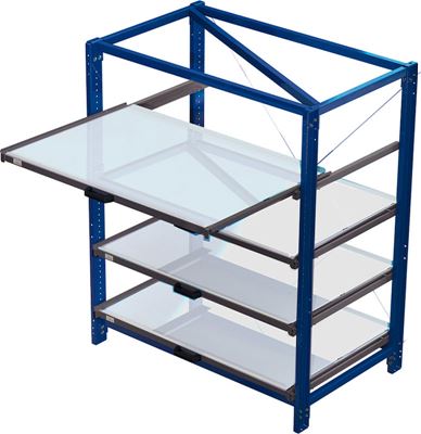 Industribyrå med 5-plan, 70% utdragbarhet, långsidesutdrag. Passar utmärkt i pallställ och tar endast en pallplats!