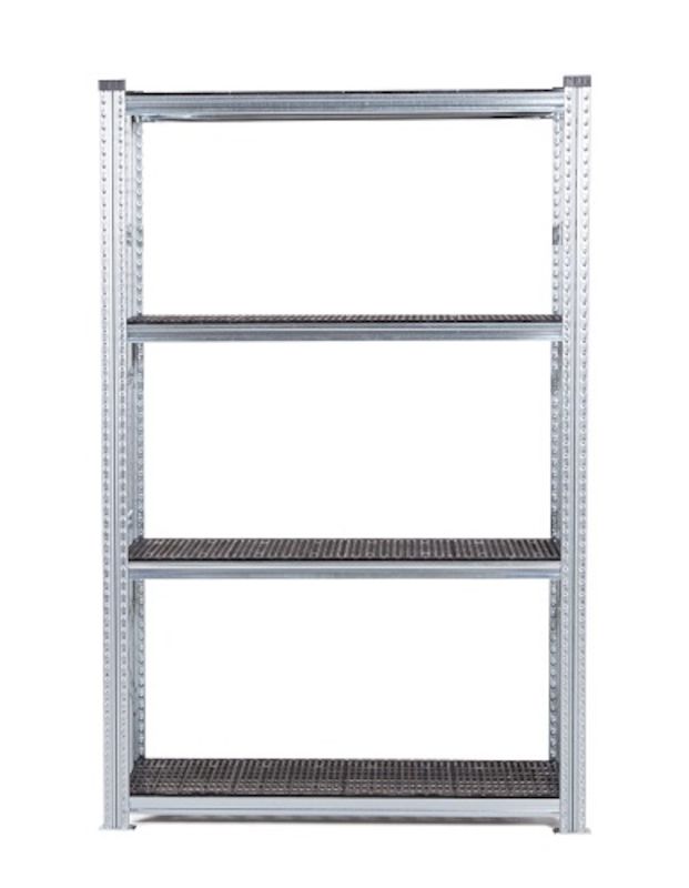 Lagerhylla Flex, grund, BxDxH 1276x600x1972, 4 st svarta hyllplan. Ett flexibelt hyllsystem av galvaniserat stål med många användningsområden. Låg egenvikt med klarar hög belastning, 135-350 kg/hyllplan. Flyttbara balkar, 33 mm:s intervall. Olika typer av hyllplan för olika arbetsmiljöer. Enkel att montera (inga bultar eller skruvar). Kan användas från båda håll, inga krysstag behövs. Gavlar levereras monterade, bärbalkar och metallfötter ingår i varje sektion. Samtliga plasthyllplan är perforerade för att fungera i miljöer med sprinklersystem då vattnet rinner igenom hyllplanen. Alla plasthyllplan är även godkända för livsmedelsmiljö.