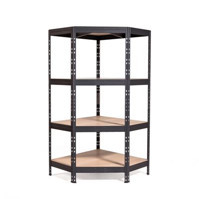 Lagerhylla Lagan Hörn. Stabil hörnhylla i stål med HDF-hyllplan. Enkel att montera, helt utan skruvar! Med grå färg (RAL 7016).