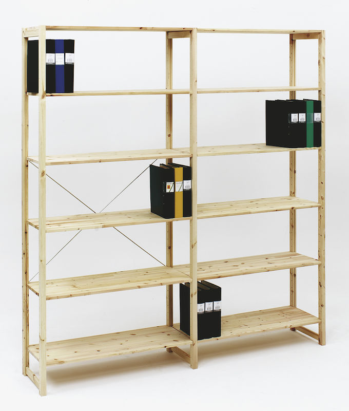 Färdiga sektioner trähyllor som finns i två olika höjder: 1780 mm med fem hyllplan (liten) samt 2180 mm med sex hyllplan (stor). Två olika bredder på sektionerna 830 mm och 1030 mm. Djupet är 300 mm eller 400 mm. Hyllorna placeras på fyra förzinkade hyllbärare i valfri höjd i steg om 50 mm.