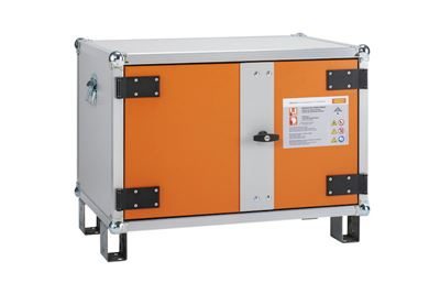 Batteriskåp Harald, med fötter, höjd 620 mm, 230 V, orange/grå. De flesta brandincidenter kopplade till litiumbatterier inträffar under laddning.