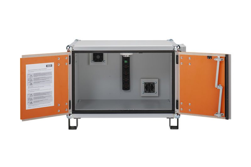BeskrivningBatteriskåp Harald, med fötter, höjd 620 mm, 230 V, orange/grå