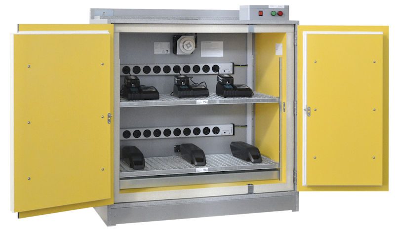 Säkerhetsskåp för batteriförvaring Beata, utan brandhämmande system, HxB 1222 x 1148 mm, 2 grenuttag. LaCont batteriskåp LI-ION Basic Charge EI 90 är en perfekt instegsmodell för