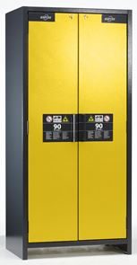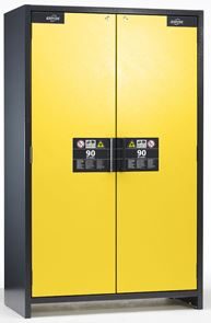 Brandsäkert Kemikalieskåp Alvik. Det brandsäkra industrikemikalieskåpet typ 90 från asecos lämpar sig för obegränsad och korrekt förvaring av brandfarliga kemikalier i arbetsutrymmen enligt DIN EN 14470-1 och TRGS 510 (bilaga 3) samt DIN EN 16121/16122. Med ett brandmotstånd på 90 minuter erbjuder det här skåpet högsta säkerhet och är både typgodkänt avseende brandmotstånd och certifierat enligt brandskydds- och GS-standarder.