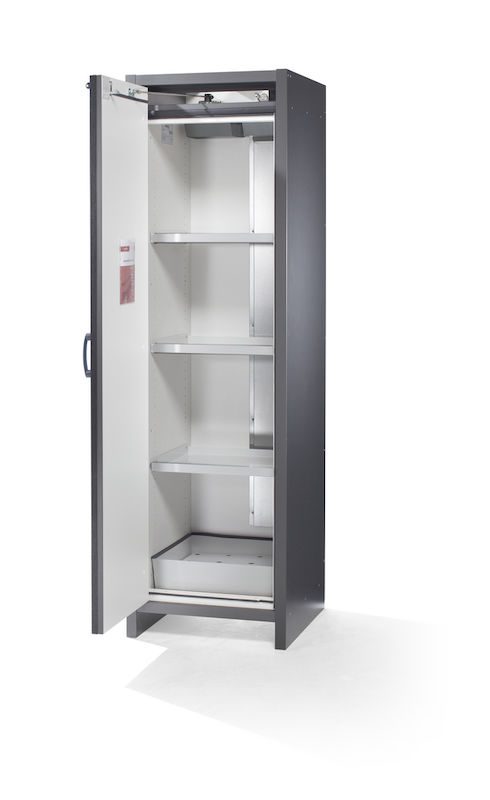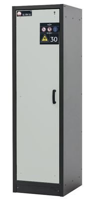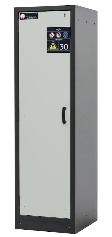 Brandsäkert Kemikalieskåp Arby, HxBxD 1947 x 564 x 620 mm, 1 dörrar. Det brandsäkra kemikalieskåpet 30 från asecos erbjuder tillförlitligt skydd för korrekt förvaring av brandfarliga kemikalier i arbetsutrymmen. Det här säkerhetsskåpet är typgodkänt och brandskyddstestat med ett brandmotstånd på 30 minuter och uppfyller därmed alla föreskrifter enligt DIN EN 14470-1 och TRGS 510, bilaga 3 (typ 30) samt DIN EN 16121/16122.