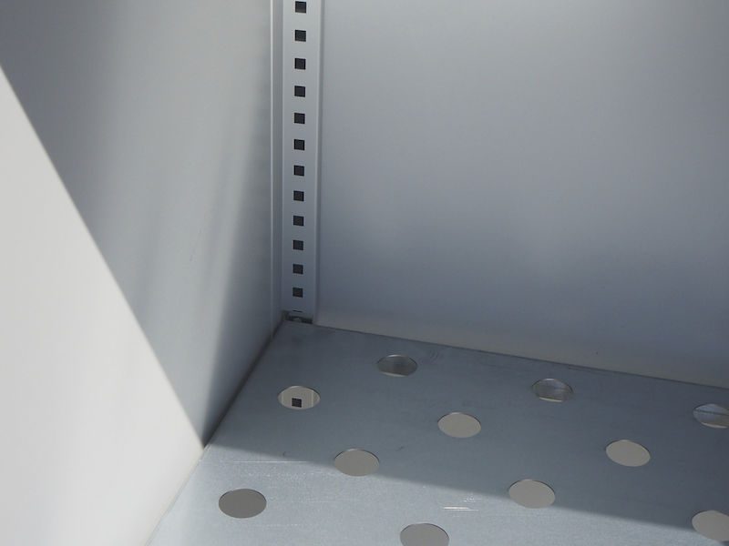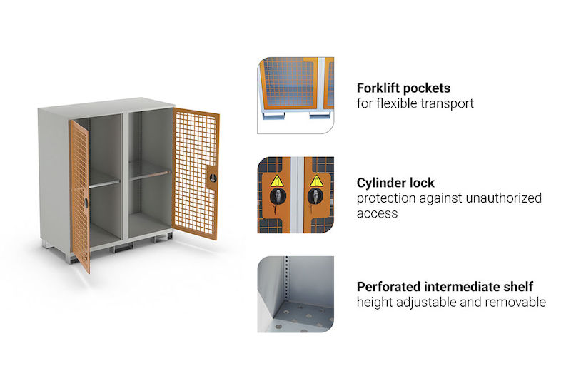 Praktiska gaffelben underlättar transport och hantering med gaffeltruck eller lyftvagn. De två uttagbara mitthyllorna av förzinkad, perforerad plåt har inställbar höjd för ännu högre flexibilitet. Gasskåpet eurokraft basic är pulverlackerat för högt korrosionsskydd och lång livslängd.