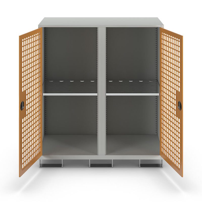 Det pulverlackerade skåpet passar för lagring av gasflaskor. Med en kapacitet på upp till 8 x 33 kg eller 20 x 11 kg har det gott om plats för olika storlekar. Det låsbara cylinderlåset tillför extra skydd och hindrar obehörig åtkomst.