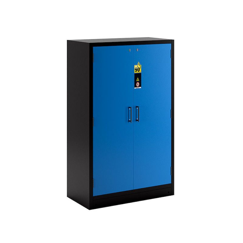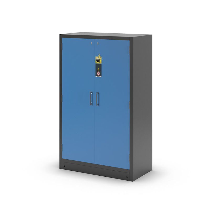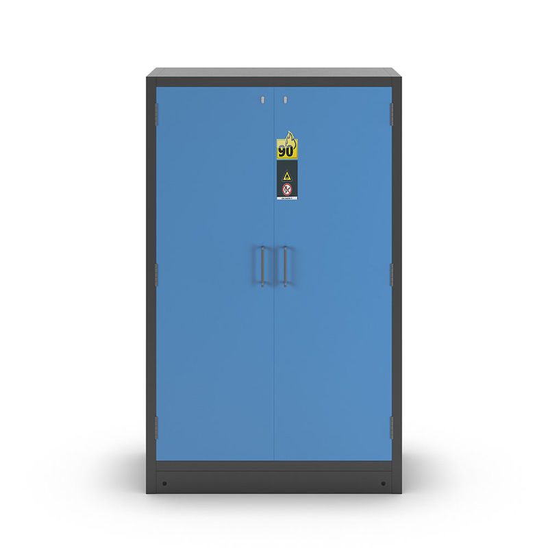 Kemikalieskåp Aston, 2 dörrar, 3 hyllplan, dörrar ljusblå. Maximalt skydd för din arbetsmiljö: Det brandsäkra kemikalieskåpet typ 90 eurokraft pro passar för korrekt lagring av brandfarliga kemikalier i arbetsutrymmen enligt DIN EN 14470-1 och TRGS 510 (bilaga 3). Skåpet står emot brand i 90 minuter och garanterar därmed hög säkerhet och tillförlitlighet i krävande miljöer.