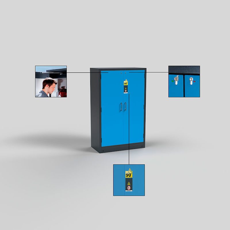 Kemikalieskåpet är tillverkat av stålplåt och behandlat med en tålig strukturlack, vilket ger en mycket robust och stabil konstruktion och en lång livslängd. Stommen är antracitgrå och dörrarna ljusblå. Skåpet har typgodkänt brandmotstånd, är brandskyddstestat och GS-testat. Tack vare en låsindikering i rött och grönt kan man snabbt och enkelt se skåpets låsstatus. Dörrarna kan ställas upp i valfri position. I händelse av brand stängs en uppställd dörr automatiskt. En inställbar dörrdämpning och trippelgångjärn ger en mjuk och tillförlitlig manövrering. Dörrarna kan låsas med ett profilcylinderlås och anslutas till en låsanläggning. Det brandsäkra kemikalieskåpet är utrustat med brandisolering och förstklassig dörrtätning som ger ett ännu högre skydd.