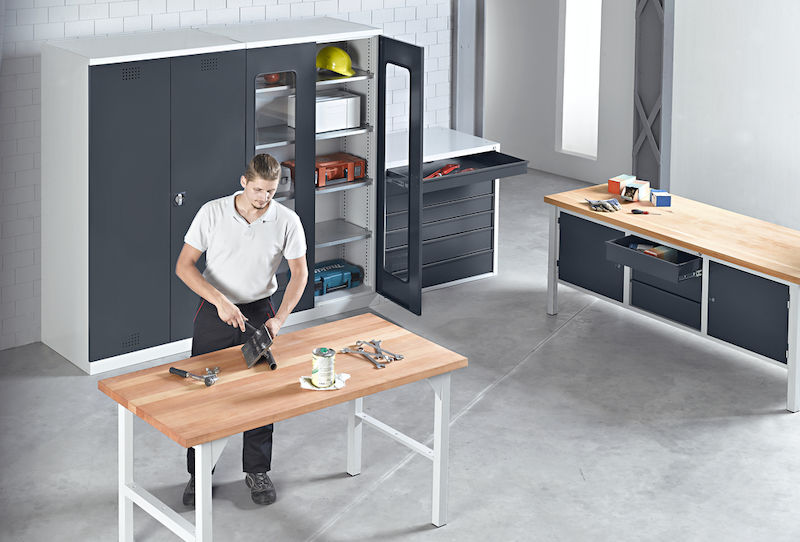 Kemikalieskåp Tom, med 3 tråghyllor och 1 bottentråg, dörrar antracitgrå. Stabil, svetsad och pulverlackerad konstruktion i stålplåt. Ljusgrå stomme RAL 7035.