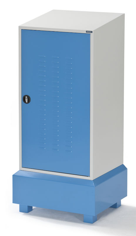 Kemikalieskåp Vito, 1 dörr, med snedtak. Miljöskåpet från eurokraft pro är en robust och säker lösning för lagring av kemikalier i fat och små behållare. Den förzinkade och pulverlackerade stålplåtskonstruktionen garanterar långvarigt skydd och stabilitet.