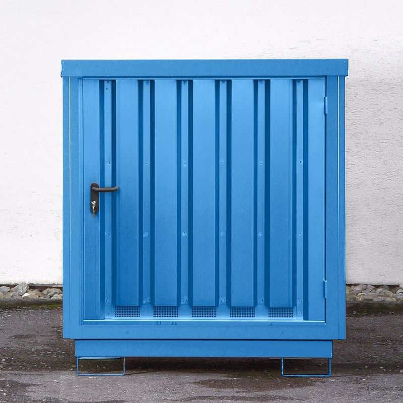 Låsbar avtappningspump, påfyllningstratt m.m. kan ställas in tillsammans med fatet (med obrännbart innehåll). Slutet utförande på alla sidorna i galvaniserad, profilerad stålplåt. Naturlig ventilation som skapas av konstruktionen.