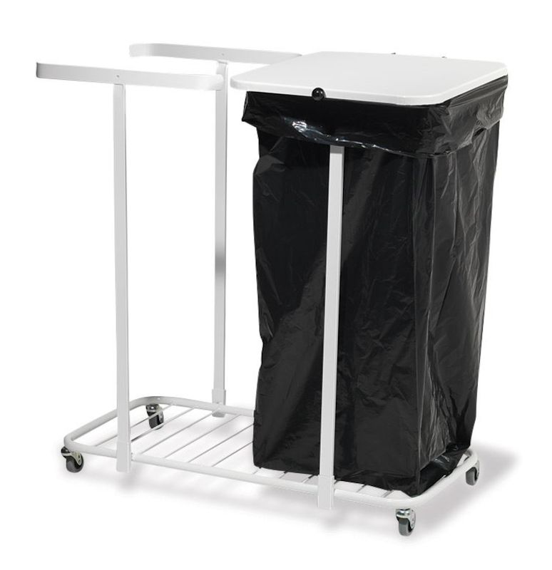 Sopsäckshållare med 4 länkhjul. Vitlackerad sopsäcksvagn tillverkad i metall med heltäckt bottenplatta och fyra länkhjul.