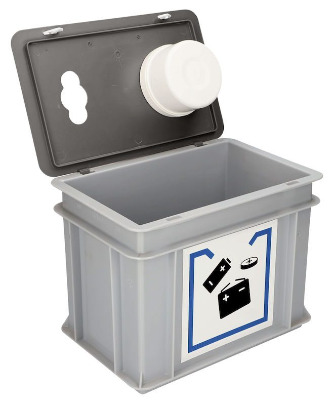 Insamlingsbox för batterier Sanna, med lock och inkastöppning, volym 20, LxBxH 400 x 300 x 235 mm. Självlåsande och plomberbara snäpplås (plomberingar, se Tillbehör).