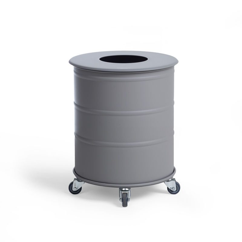 Soptunna Brooklyn Bin Mini, H 450 mm, hjul, singel med lock, grå. En tunna med hög kvalité i tidlös och klassisk design. Tunna ø 330 eller 400 mm av stålplåt, pulverlackerad med matt färg. Säckhållare i tunnan, anpassad för 70 liters säckar. Finns som singel/dubbel/trippel i 3 olika färger.